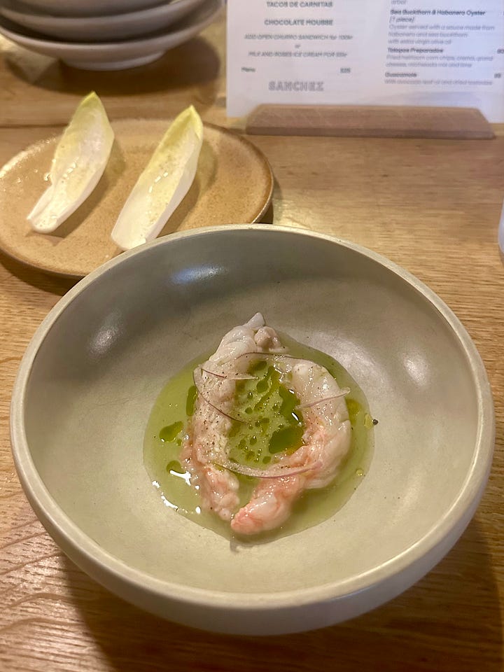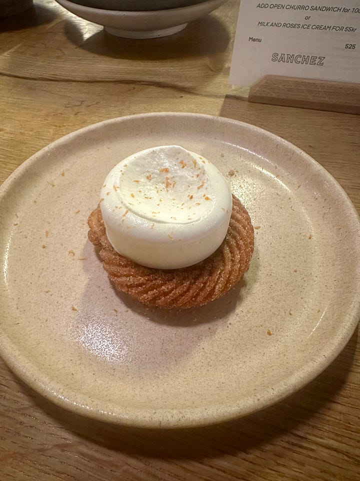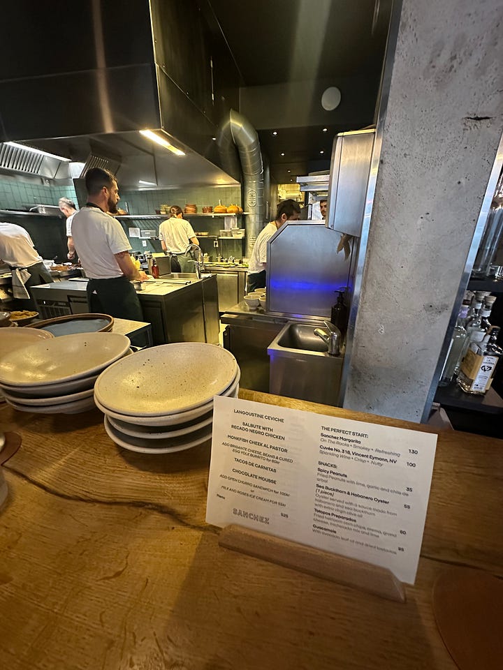 I landed late and set out to search for some food in Vesterbro, where my Google Maps showed a cluster of saved blue bookmark icons. The first two places I walked into told me that their kitchens had just closed. I kept making my way down Istedgade and walked into Sanchez, which had a particularly convivial buzz coming out of the door on the street corner.